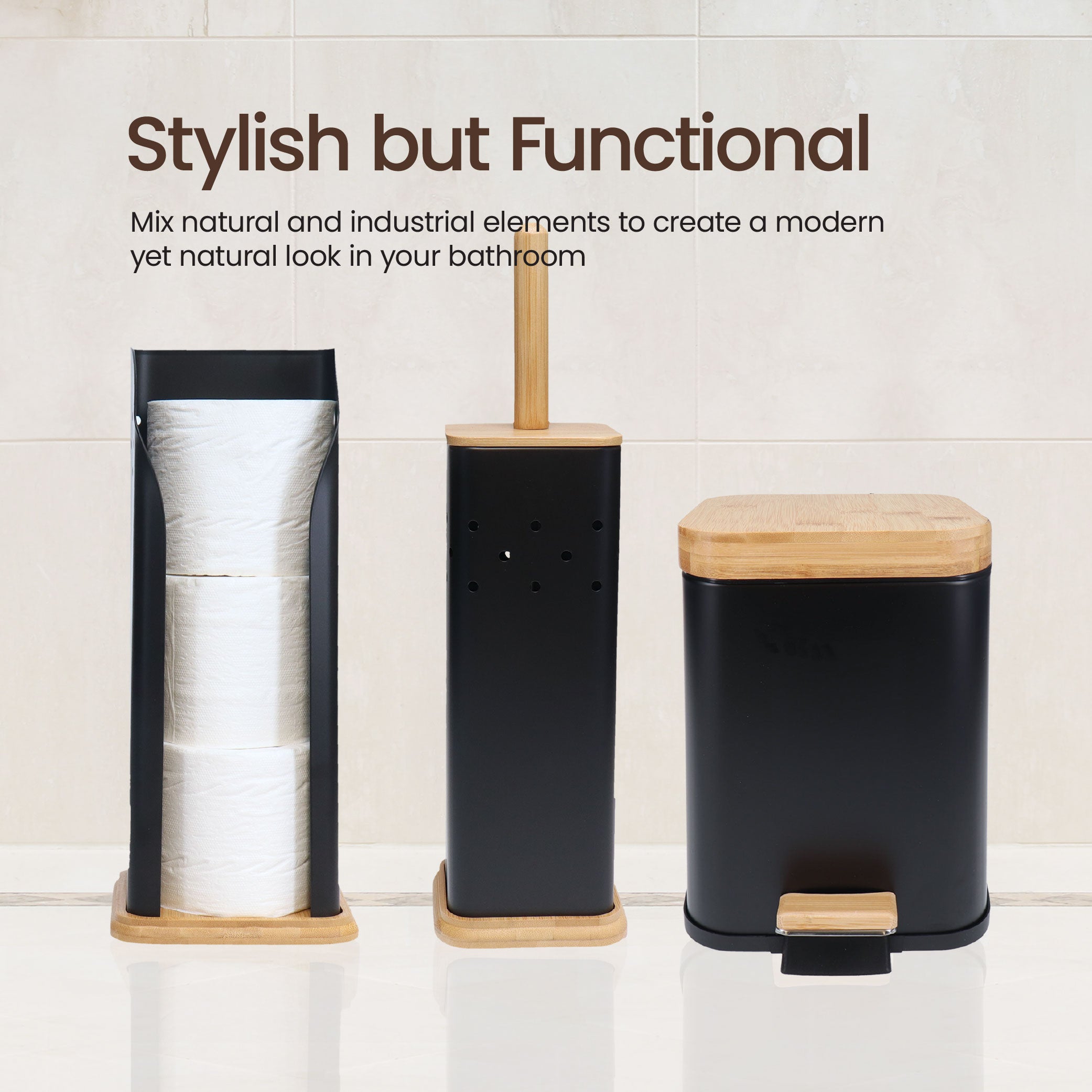The set includes a toilet brush, roll holder, and waste bin, offering a comprehensive solution for your bathroom essentials. This all-in-one design maximizes space utilization and keeps your bathroom organized.