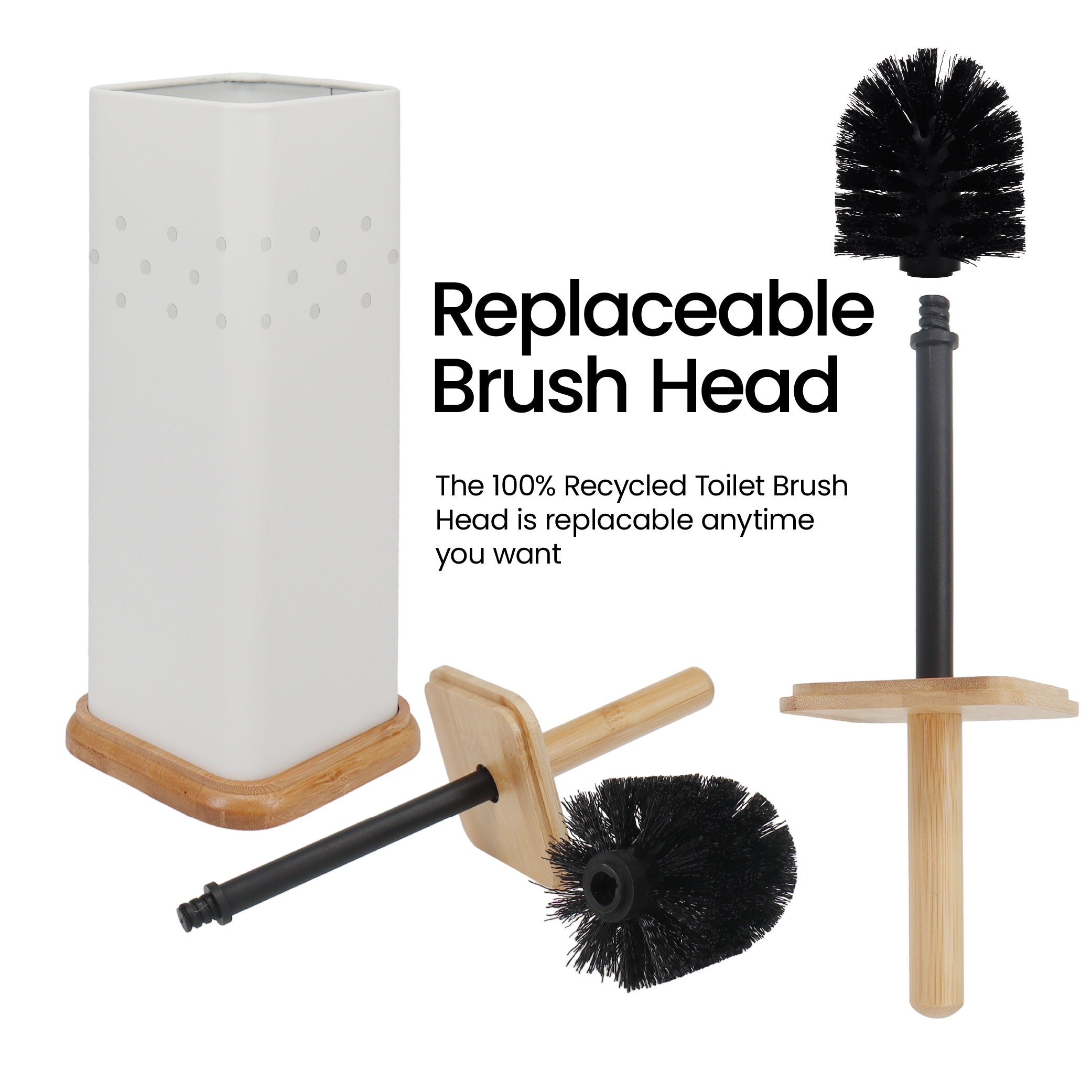 The toilet brush features sturdy bristles and a natural bamboo handle for effective cleaning. It’s eco-friendly and includes a sleek brush holder that keeps it neatly in place.